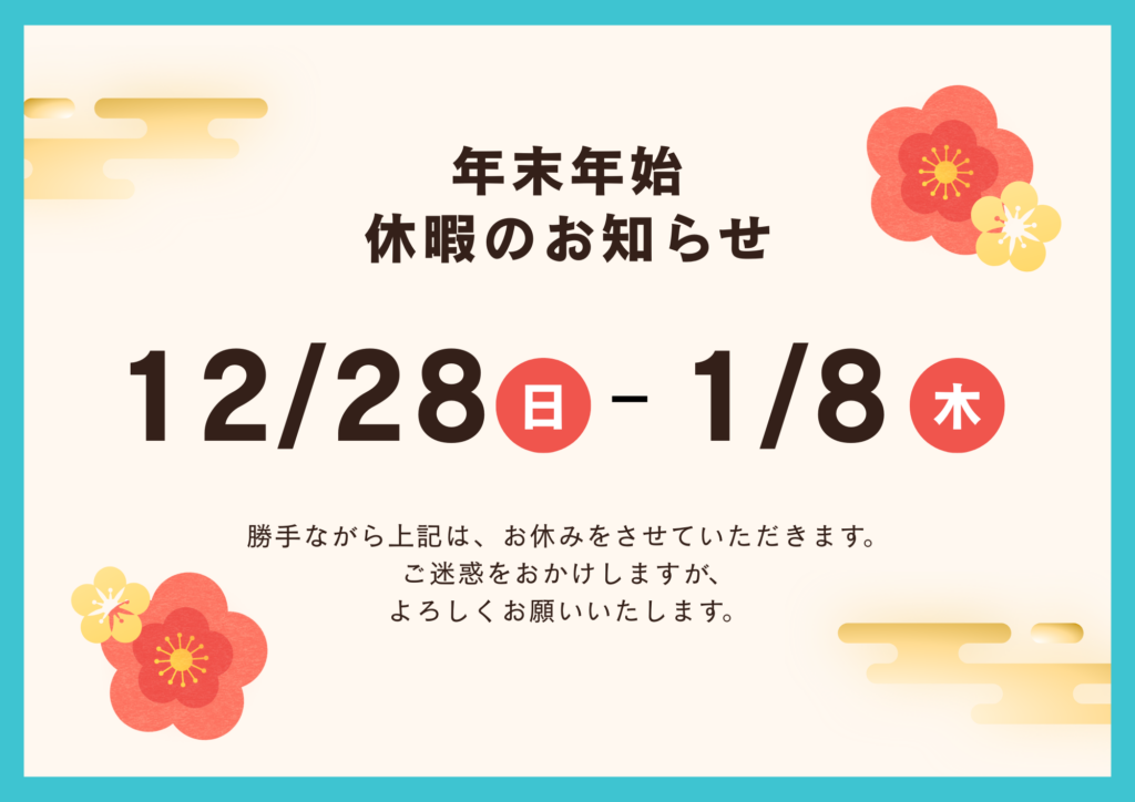 誠に勝手ながら12月28日(日)〜2026年1月8日(木)までは年末年始休暇とさせていただきます。